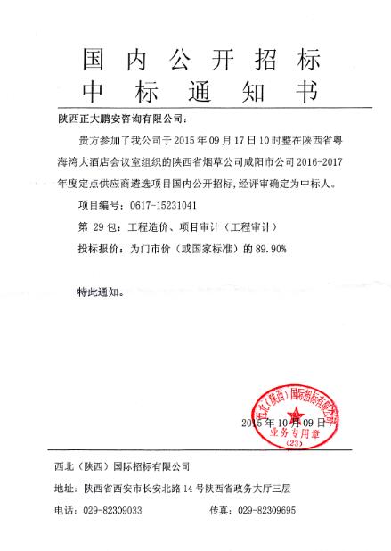 國內(nèi)公開招標(biāo)工程造價(jià)、項(xiàng)目審計(jì)中標(biāo)通知書