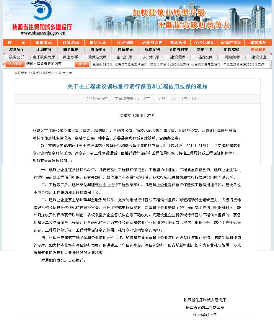 為了貫徹落實省政府《關于推進建筑業(yè)轉型升級加快改革發(fā)展的指導意見》(陜政發(fā)〔2014〕31號),切實減輕建筑業(yè)企業(yè)流動資金短缺壓力,決定在全省工程建設領域全面推行銀行保函和工程信用擔保(特指工程履約或工程保證擔保等)?,F(xiàn)就有關事項通知如下: