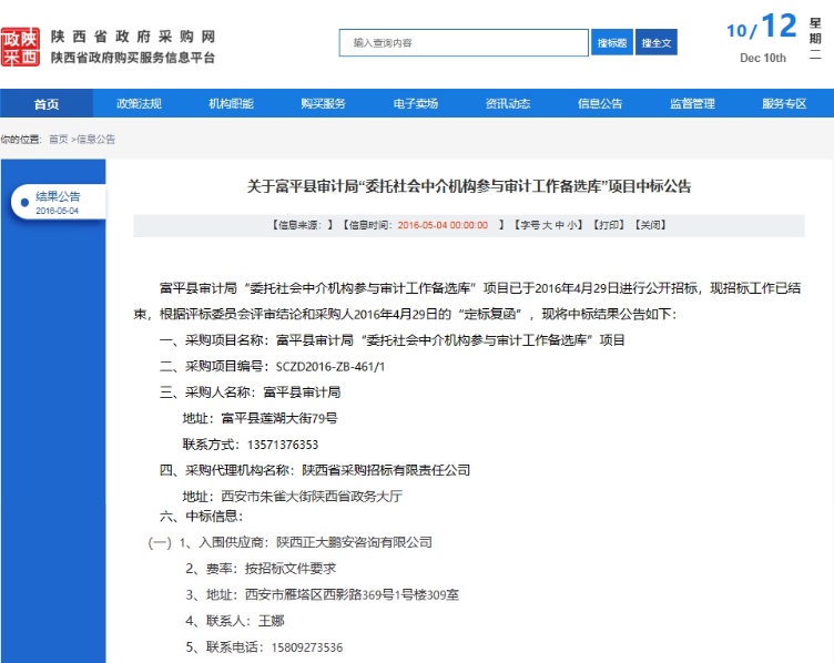 2016年5月4日,經(jīng)評標(biāo)委員會綜合評審,招標(biāo)人確認(rèn),正大鵬安建設(shè)項目管理有限公司中標(biāo)關(guān)于富平縣審計局“委托社會中介機構(gòu)參與審計工作備選庫”項目。
