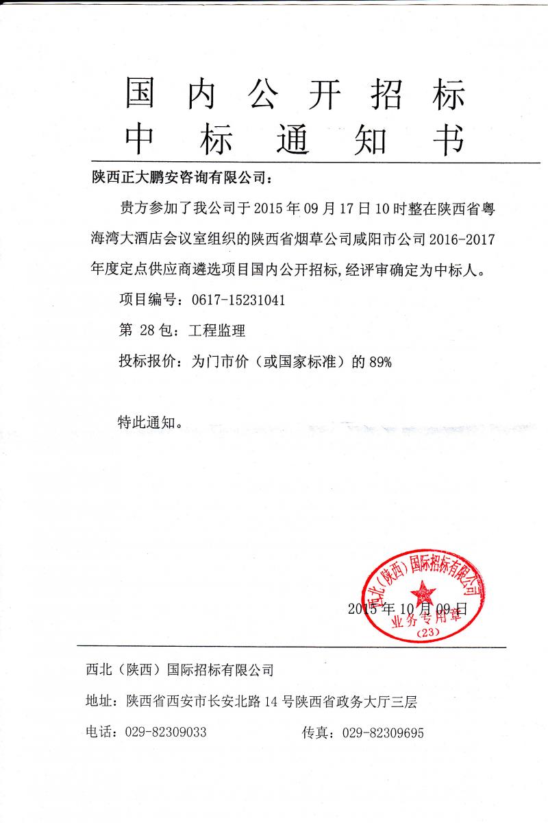 正大鵬安入圍陜西省煙草公司咸陽(yáng)市公司2016-2017年度定點(diǎn)供應(yīng)商遴選項(xiàng)目