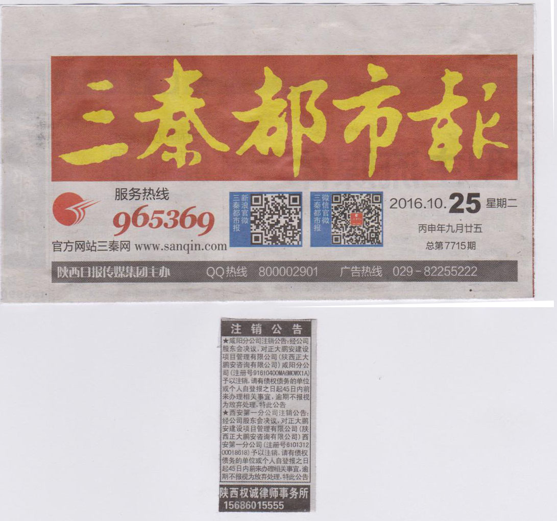 經(jīng)公司股東會決議,對正大鵬安建設(shè)項目管理有限公司(陜西正大鵬安咨詢有限公司)咸陽分公司(注冊號91610400MA6M0WX1A)予以注銷,請有債權(quán)債務(wù)的單位或個人自登報之日起45日內(nèi)前來辦理相關(guān)事宜,逾期不報視為放棄處理,特此公告。