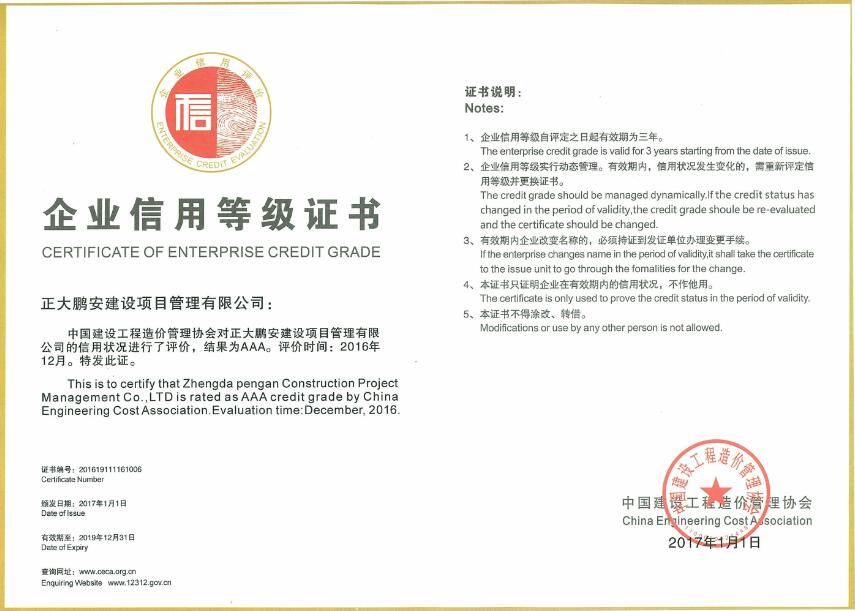 正大鵬安公司在由中國建設工程造價管理協(xié)會組織的2016年度全國工程造價咨詢企業(yè)信用評價中,被評定為AAA級(最高等級)。