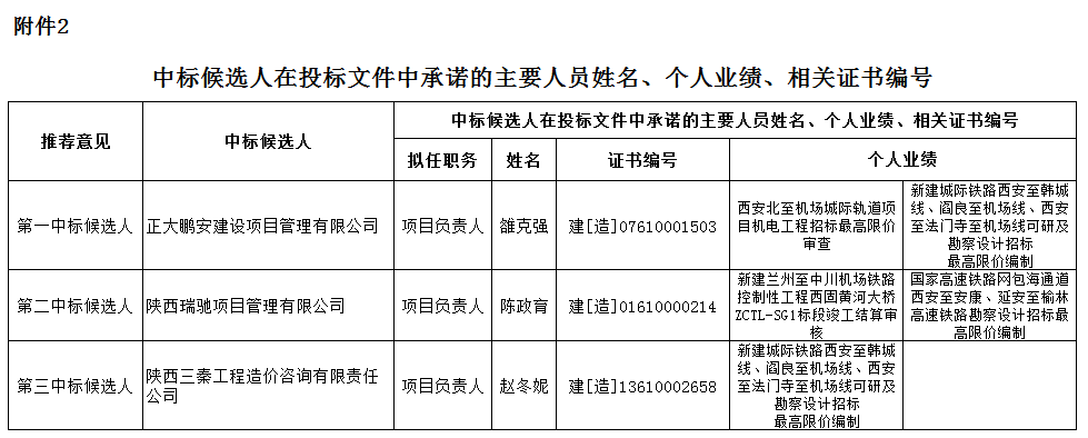 2.中標(biāo)候選人在投標(biāo)文件中承諾的主要人員姓名、個(gè)人業(yè)績(jī)、相關(guān)證書編號(hào);