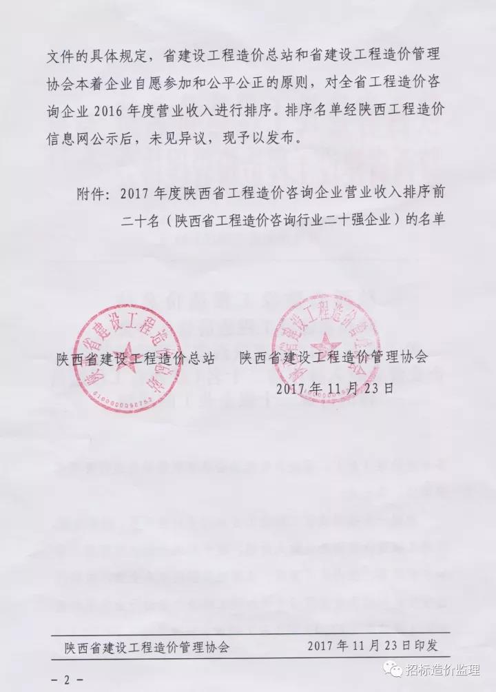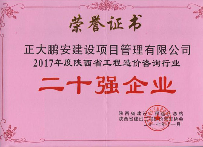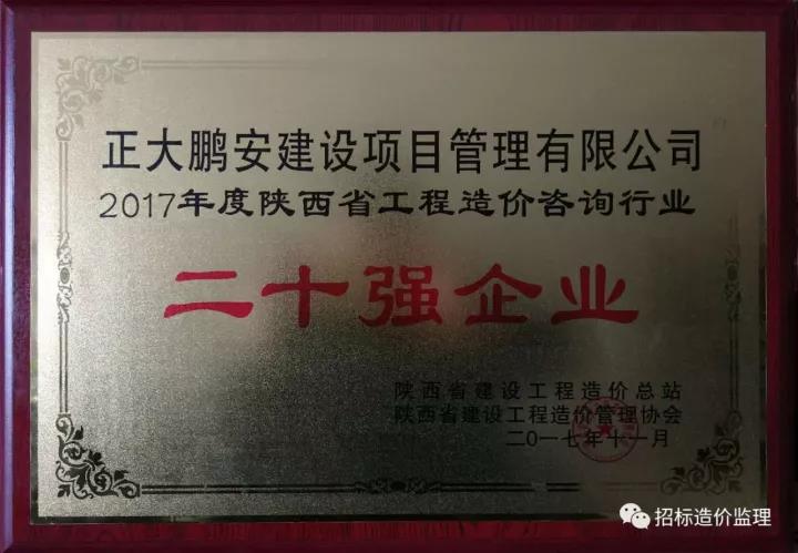 2017年12月4日,陜西省建設(shè)工程造價(jià)總站和陜西省建設(shè)工程造價(jià)管理協(xié)會(huì)在西安高速神舟酒店聯(lián)合發(fā)布了《2017年度陜西省工程造價(jià)咨詢行業(yè)二十強(qiáng)企業(yè)名單》,正大鵬安建設(shè)項(xiàng)目管理有限公司憑借企業(yè)誠(chéng)信度好、市場(chǎng)占有率大、行業(yè)認(rèn)可度高,榮登金榜。