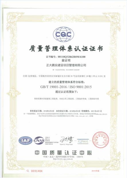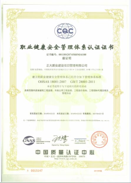 日前,正大鵬安公司申報的ISO9001:2015質量管理體系認證、ISO14001:2015環(huán)境管理體系認證和OHSAS18001:2007職業(yè)健康安全管理體系認證經(jīng)中國質量認證中心審定,獲準通過并頒發(fā)了認證證書。