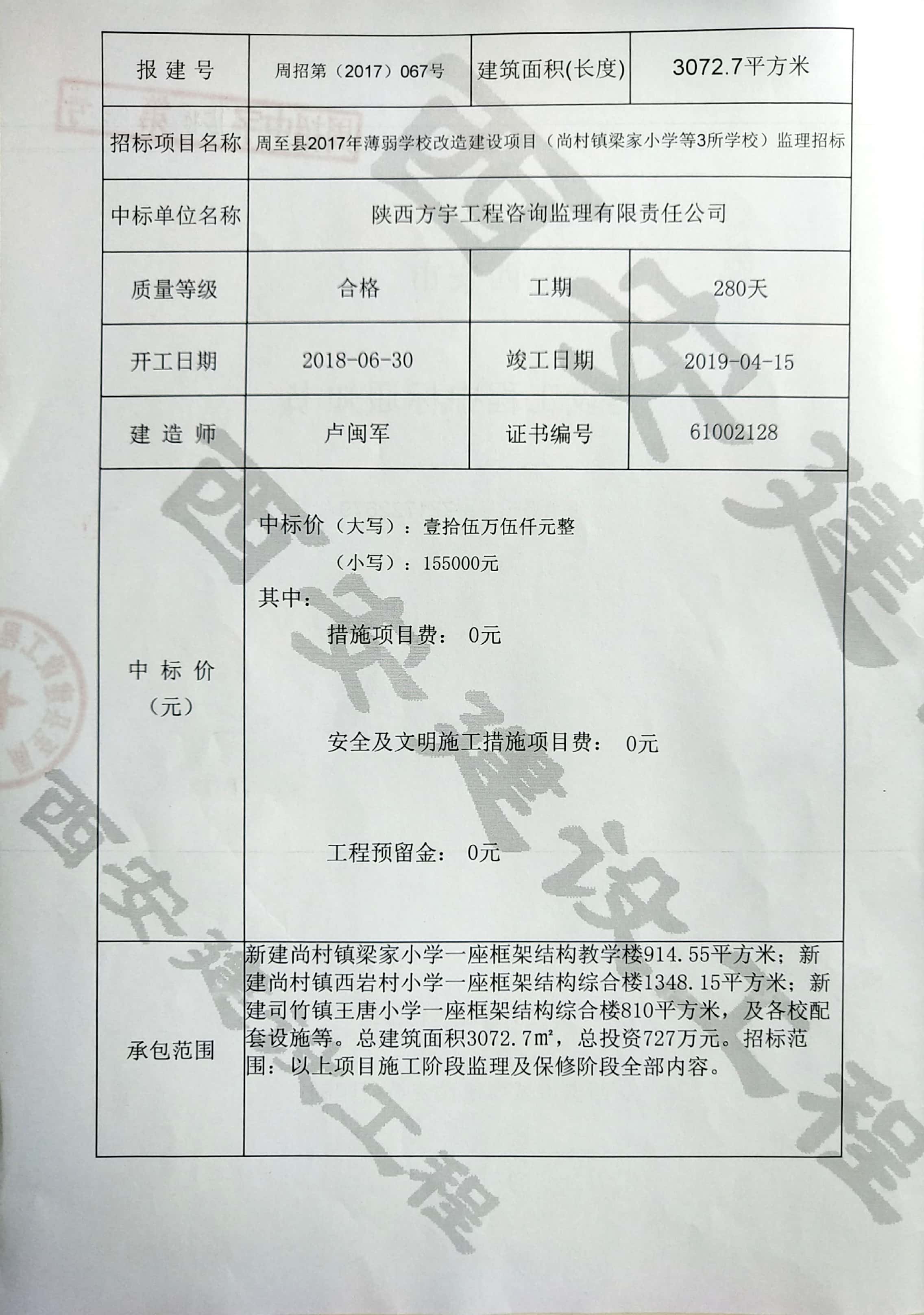 周至縣2017年薄弱學校改造建設項目(尚村鎮(zhèn)梁家小學等3所學校)施工及監(jiān)理招標
