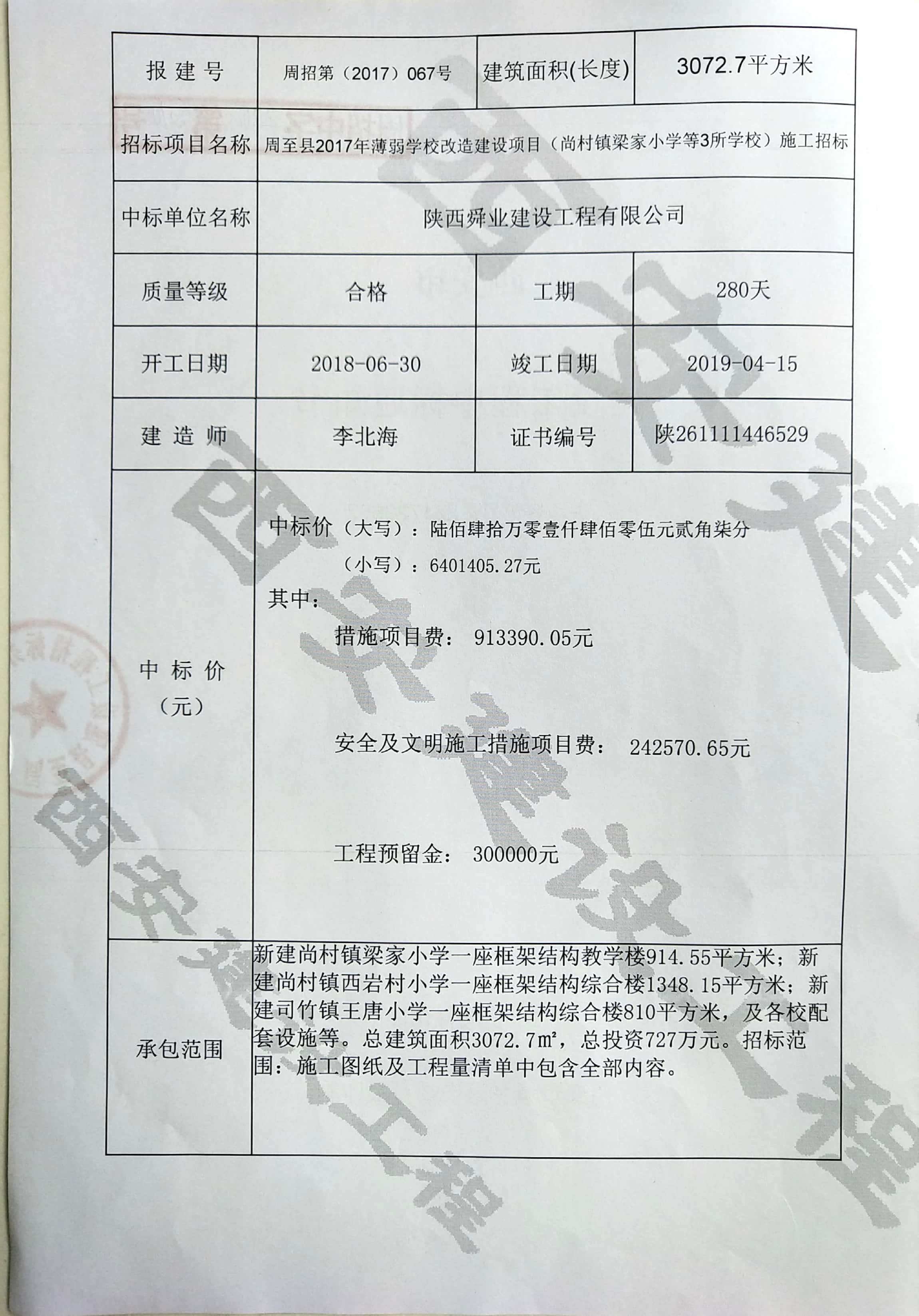 項目名稱:周至縣2017年薄弱學校改造建設項目(尚村鎮(zhèn)梁家小學等3所學校)施工及監(jiān)理招標