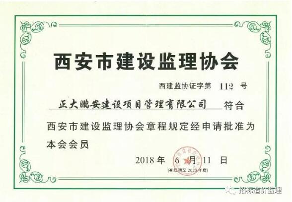 正大鵬安建設(shè)項(xiàng)目管理有限公司被批準(zhǔn)為西安市建設(shè)監(jiān)理協(xié)會會員,并頒發(fā)了會員單位證書。