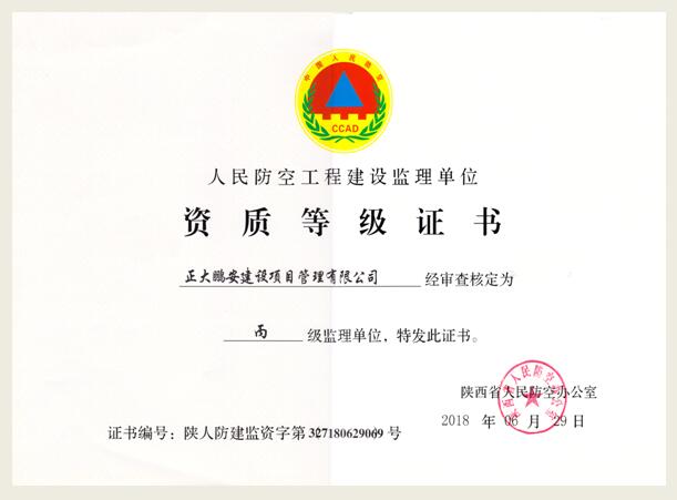2018年6月29日,陜西省人民防空辦公室審查核定正大鵬安建設(shè)項(xiàng)目管理有限公司為人民防空工程建設(shè)監(jiān)理單位,資質(zhì)等級為丙級,并頒發(fā)了資質(zhì)證書。