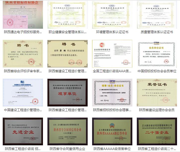 正大鵬安公司在資質(zhì)資格不斷增加、不斷提升的同時,市場占有率和社會認(rèn)可度也隨之提高。近年來,正大鵬安公司先后榮獲陜西省工程造價咨詢招標(biāo)代理行業(yè)先進(jìn)企業(yè)、陜西省守合同重信用企業(yè)、陜西省AAAAA級信譽(yù)單位、陜西省工程造價咨詢行業(yè)二十強(qiáng)企業(yè)、全國工程造價咨詢AAA級(最高級)信用企業(yè)等社會榮譽(yù),并榮獲ISO9001:2015質(zhì)量管理體系認(rèn)證、ISO14001:2015環(huán)境管理體系認(rèn)證和OHSAS18001:2007職業(yè)健康安全管理體系認(rèn)證。
