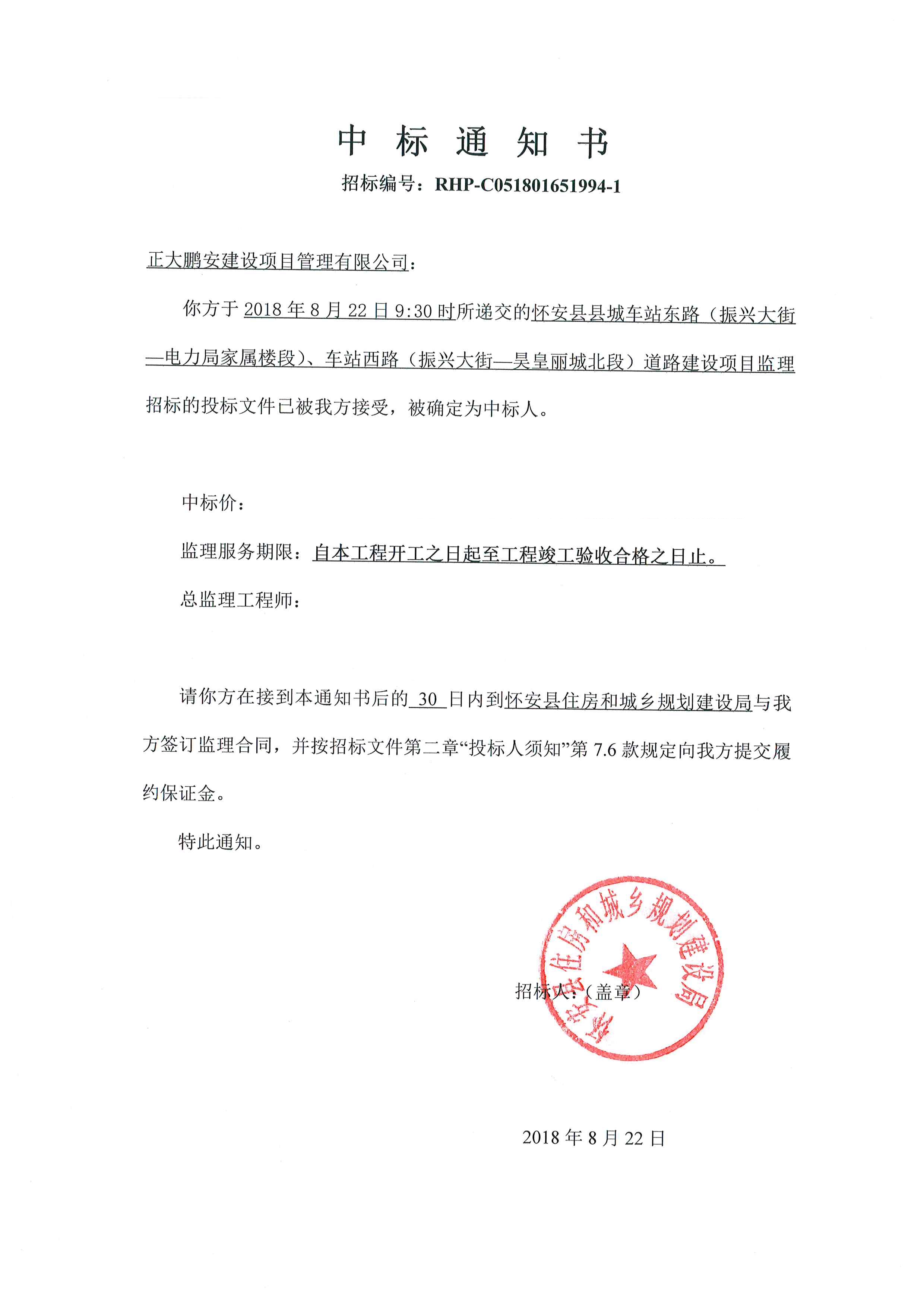 2018年8月22日,經(jīng)評標(biāo)委員會綜合評審,招標(biāo)人確認,正大鵬安中標(biāo)懷安縣縣城車站東路、西路工程監(jiān)理。