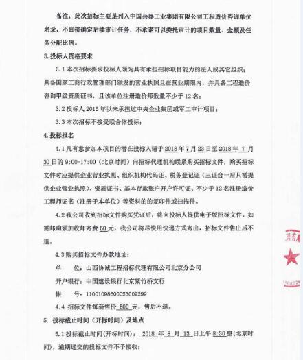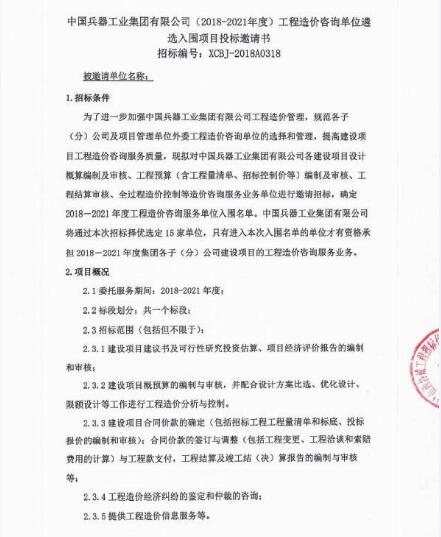 2018年8月13日,中國兵器工業(yè)集團就(2018—2021年度)工程造價咨詢單位遴選入圍項目進行了公開招標。