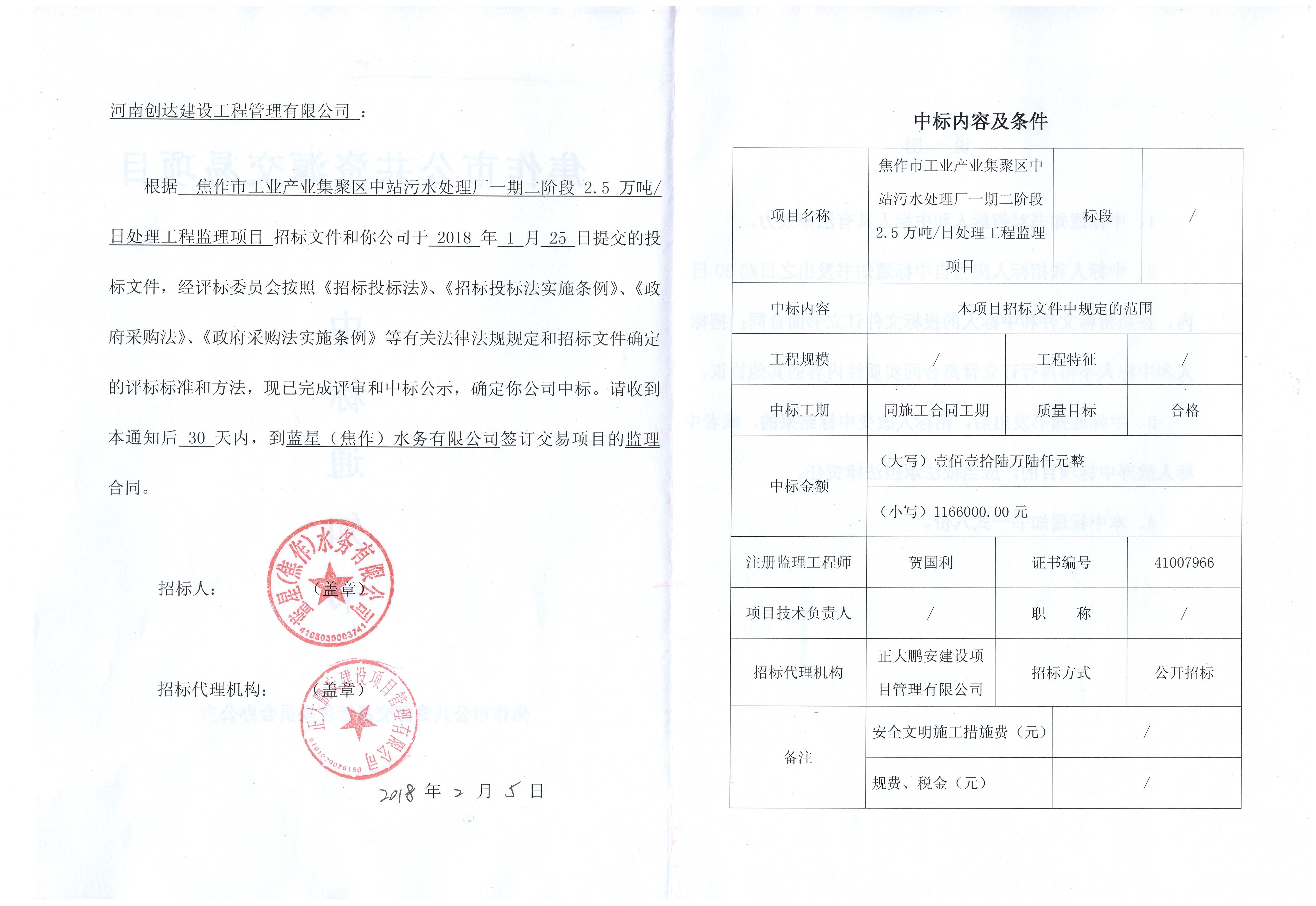 焦作市工業(yè)集聚區(qū)中站污水處理廠一期二階段2.5萬(wàn)噸/日處理工程