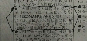 經(jīng)公司股東會決議,對正大鵬安建設(shè)項目管理有限公司潢川分公司(注冊號91411526MA44G8PW8J)予以注銷,請有債權(quán)債務(wù)的單位和個人自登報之日起45日內(nèi)前來辦理相關(guān)事宜,逾期不報視為放棄處理,特此公告。