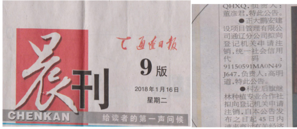 經(jīng)公司股東會決議,對正大鵬安建設(shè)項目管理有限公司通遼分公司(注冊號91150591MAON49J647)予以注銷,請有債權(quán)債務(wù)的單位或個人自登報之日起45日內(nèi)前來辦理相關(guān)事宜,逾期不報視為放棄處理,特此公告。