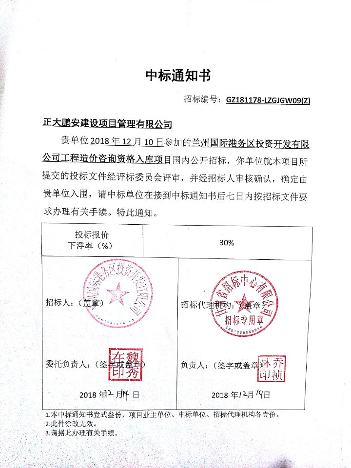 2018年12月14日,經(jīng)評(píng)標(biāo)委員會(huì)綜合評(píng)審,招標(biāo)人確認(rèn),正大鵬安建設(shè)項(xiàng)目管理有限公司中標(biāo)蘭州國際港務(wù)區(qū)投資開發(fā)有限公司工程造價(jià)咨詢資格入庫項(xiàng)目。