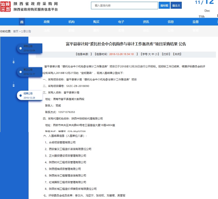 2018年12月8日,經(jīng)評標委員會綜合評審,招標人確認,正大鵬安建設項目管理有限公司中標富平縣審計局“委托社會中介機構(gòu)參與審計工作備選庫”項目