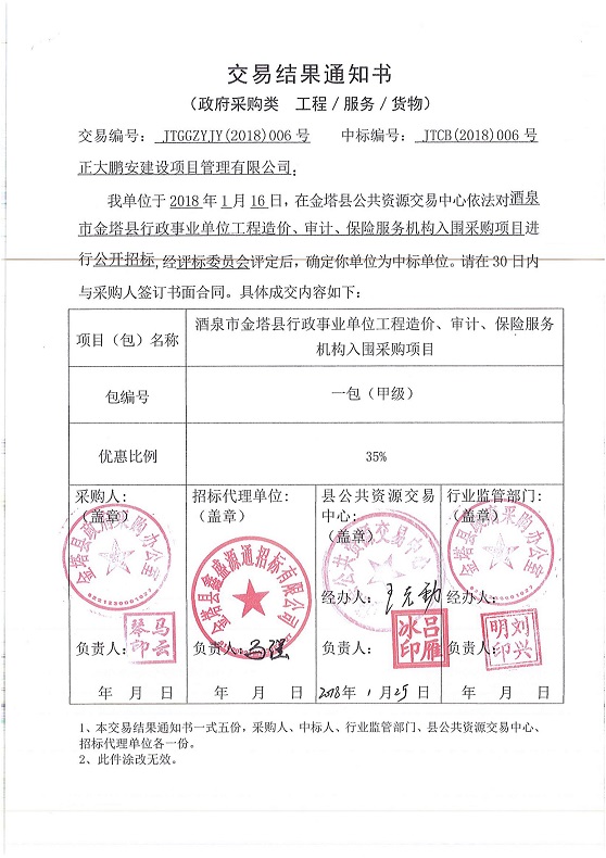 2018年1月16日,經評標委員會綜合評審,招標人確認,正大鵬安建設項目管理有限公司中標“酒泉市金塔縣行政事業(yè)單位工程造價、審計、保險服務機構入圍采購項目”。