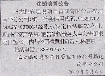 經(jīng)公司股東會決議,對正大鵬安建設(shè)項目管理有限公司福建南平分公司(注冊號91350702MA2Y483JXG)予以注銷,請有債權(quán)債務的單位和個人自登報之日起45日內(nèi)前來辦理相關(guān)事宜,逾期不報視為放棄處理,特此公告。