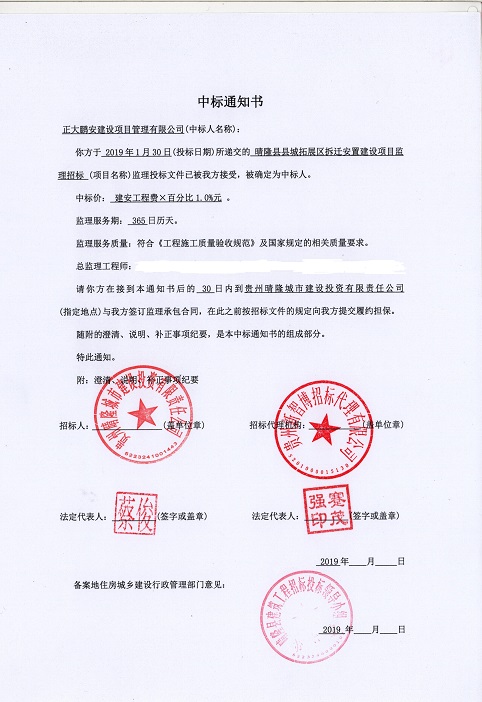 2019年1月,經(jīng)評(píng)標(biāo)委員會(huì)評(píng)定,招標(biāo)人確認(rèn),正大鵬安建設(shè)項(xiàng)目管理有限公司中標(biāo)晴隆縣縣城拓展區(qū)拆遷安置建設(shè)項(xiàng)目監(jiān)理招標(biāo)項(xiàng)目。