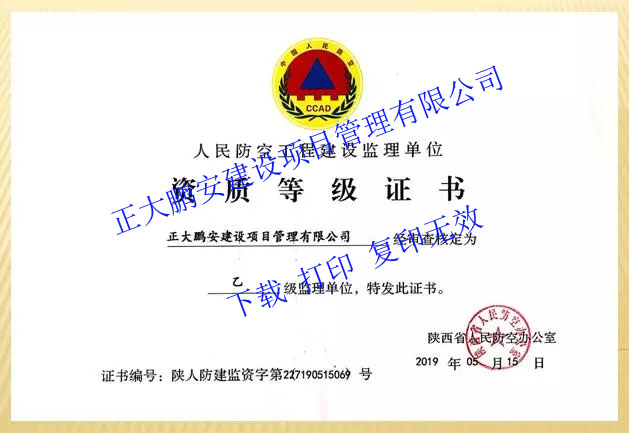 2019年5月15日,陜西省人民防空辦公室審查核定正大鵬安建設(shè)項(xiàng)目管理有限公司為人民防空工程建設(shè)監(jiān)理單位,資質(zhì)等級(jí)為乙級(jí),并頒發(fā)了資質(zhì)證書(shū)。
