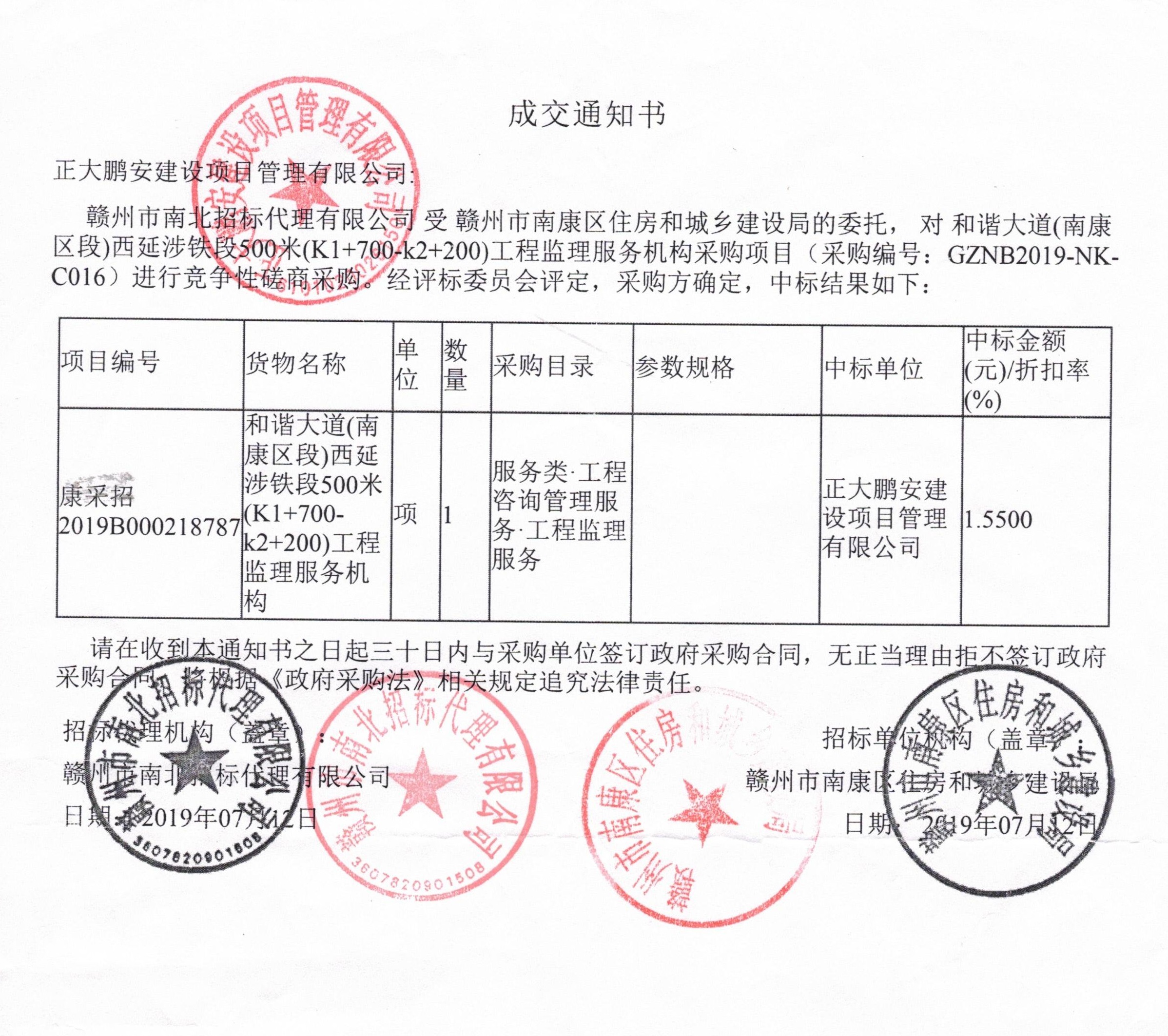 近日,和諧大道(南康區(qū)段)西延涉鐵段500米(K1+700-K2+200)工程監(jiān)理服務(wù)機(jī)構(gòu)監(jiān)理項(xiàng)目進(jìn)行公開招標(biāo),經(jīng)評(píng)標(biāo)委員會(huì)綜合評(píng)審,采購人確認(rèn),正大鵬安公司中標(biāo)該項(xiàng)目。