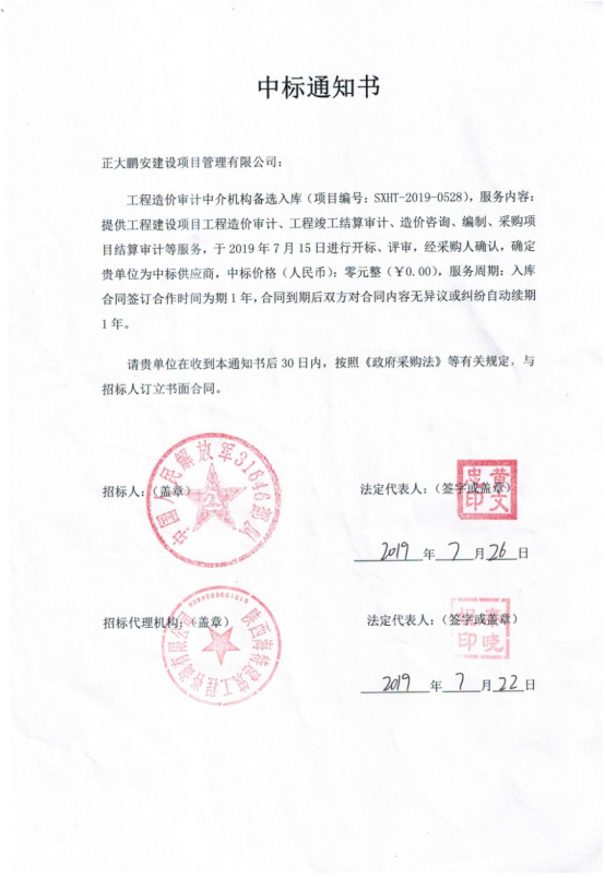 2019年07月15日,經(jīng)評標委員會評定,招標人確認,正大鵬安建設項目管理有限公司中標中國人民解放軍31646部隊工程造價審計中介機構備選入庫項目。