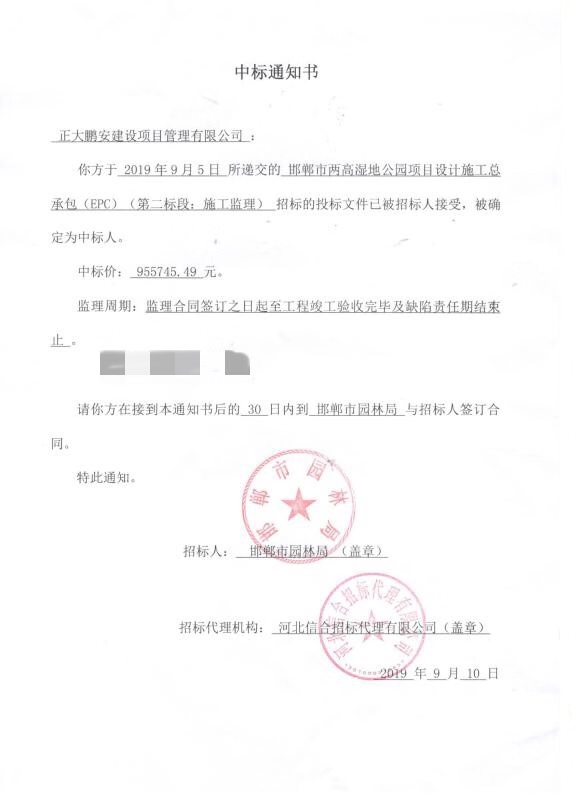 正大鵬安公司中標(biāo)“邯鄲市兩高濕地公園項(xiàng)目設(shè)計(jì)施工總承包(EPC)(第二標(biāo)段:施工監(jiān)理)”