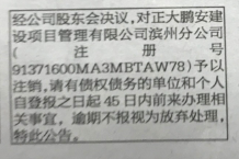 經(jīng)公司股東會決議,對正大鵬安建設(shè)項目管理有限公司濱州分公司(注冊號:91371600MA3MBTAW78)予以注銷,請有債權(quán)債務(wù)的單位和個人自登報之日起45日內(nèi)前來辦理相關(guān)事宜,逾期不報視為放棄處理,特此公告。