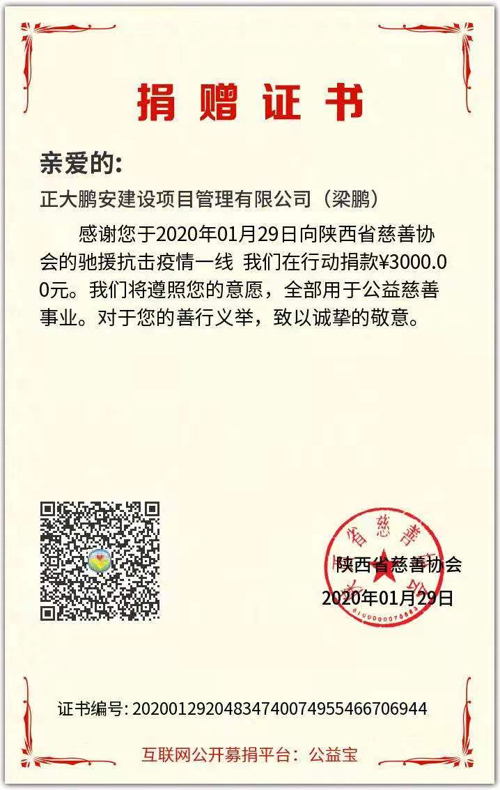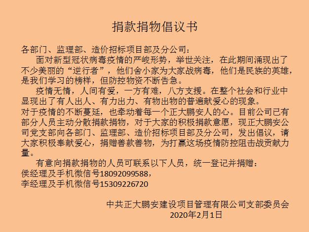新冠無情,人間有愛。2月1日,在新冠肺炎肆瘧橫行之際,正大鵬安建設項目管理有限公司黨支部組織愛心捐贈活動,向包括分支在內的公司廣大黨員和全體員工發(fā)出了《捐款捐物倡議書》。