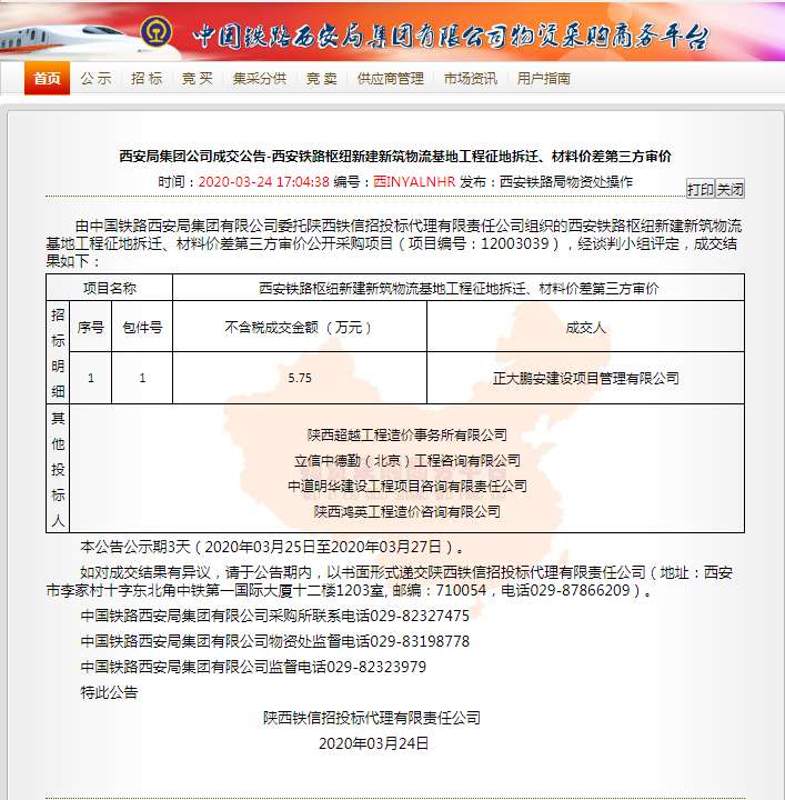 正大鵬安中標(biāo)西安局集團(tuán)公司西安鐵路樞紐新建新筑物流基地工程征地拆遷、材料價(jià)差第三方審價(jià)項(xiàng)目