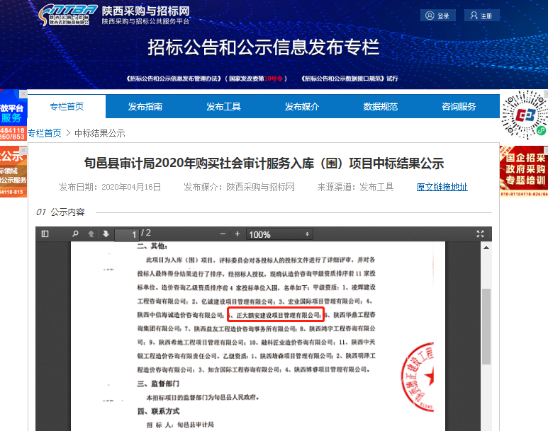 2020年4月,經(jīng)評標委員會評定,招標人確認,正大鵬安公司中標旬邑縣審計局2020年購買社會審計服務(wù)入庫(圍)項目。