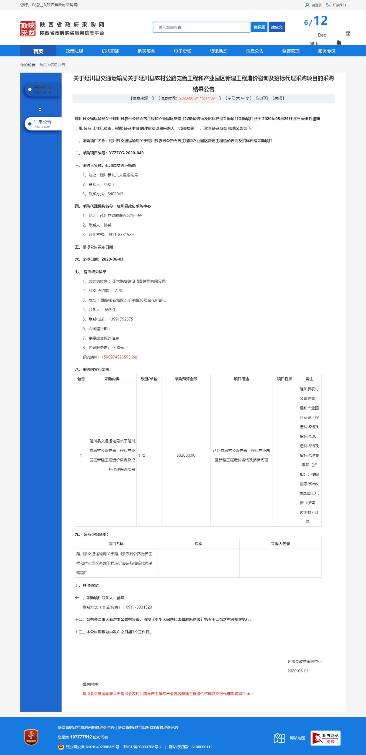 2020年5月29日,經(jīng)評(píng)標(biāo)委員會(huì)綜合評(píng)審,招標(biāo)人確認(rèn),正大鵬安建設(shè)項(xiàng)目管理有限公司中標(biāo)延川縣交通運(yùn)輸局關(guān)于延川縣農(nóng)村公路完善工程和產(chǎn)業(yè)園區(qū)新建工程造價(jià)咨詢(xún)及招標(biāo)代理采購(gòu)項(xiàng)目。