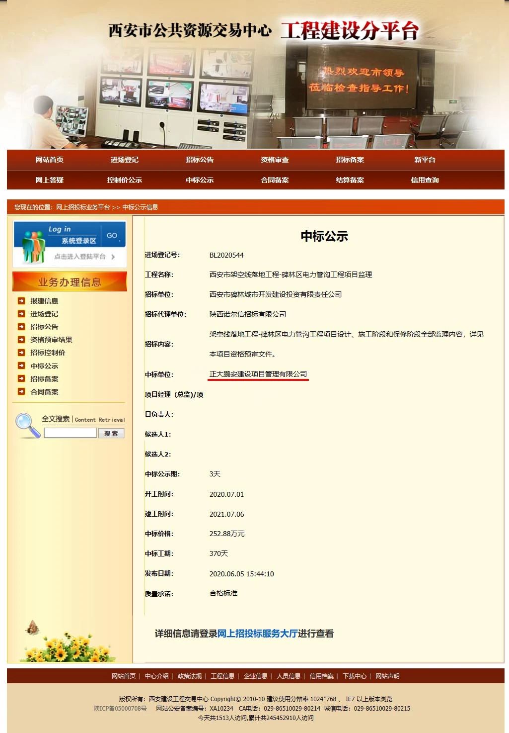 西安市碑林城市開發(fā)建設(shè)投資有限責(zé)任公司委托第三方,就“西安市架空線落地工程-碑林區(qū)電力管溝工程項目監(jiān)理 ” 進行了公開招標,經(jīng)評標委員會綜合評審,招標人確認,正大鵬安公司成功中標該項目。
