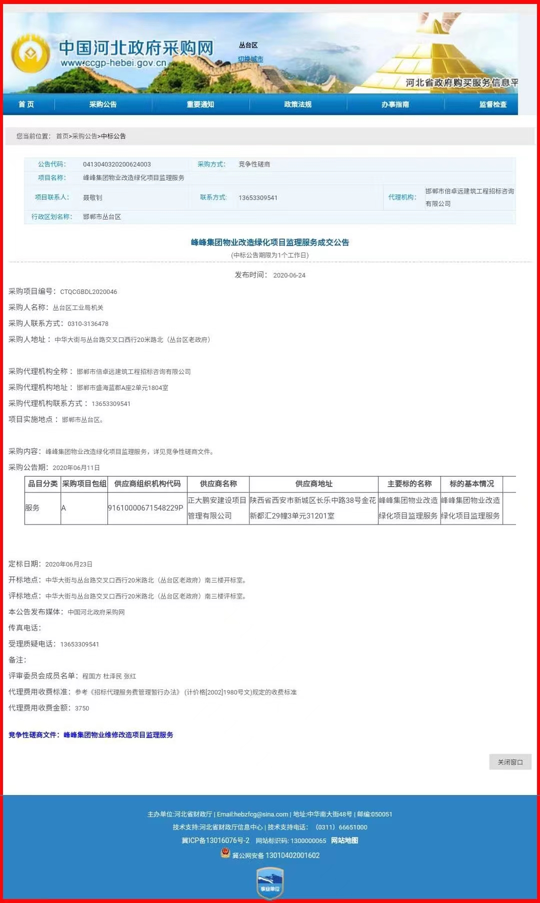 2020年6月,經(jīng)評標(biāo)委員會評定,招標(biāo)人確認(rèn),正大鵬安建設(shè)項(xiàng)目管理有限公司中標(biāo)邯鄲市叢臺區(qū)工業(yè)局的“峰峰集團(tuán)物業(yè)改造綠化項(xiàng)目監(jiān)理服務(wù)”項(xiàng)目。