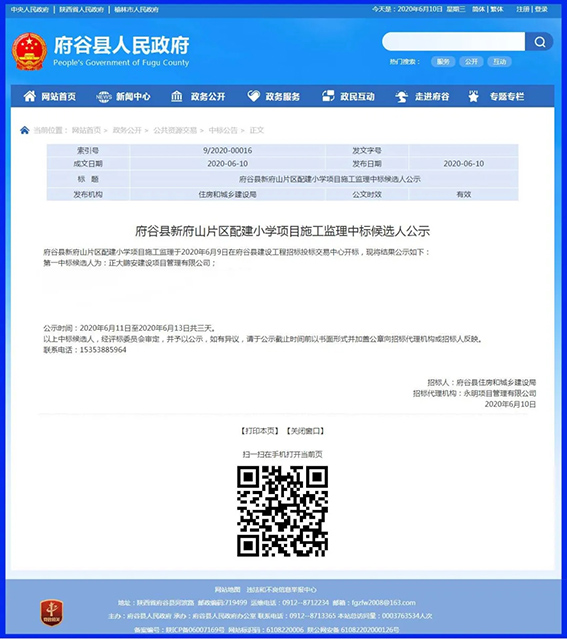 6月9日榆林市府谷縣住房和城鄉(xiāng)建設(shè)局委托第三方,就“府谷縣新府山片區(qū)配建小學(xué)項(xiàng)目監(jiān)理”進(jìn)行了公開招標(biāo),經(jīng)評標(biāo)委員會綜合評審,采購人確認(rèn),正大鵬安公司中標(biāo)該項(xiàng)目。