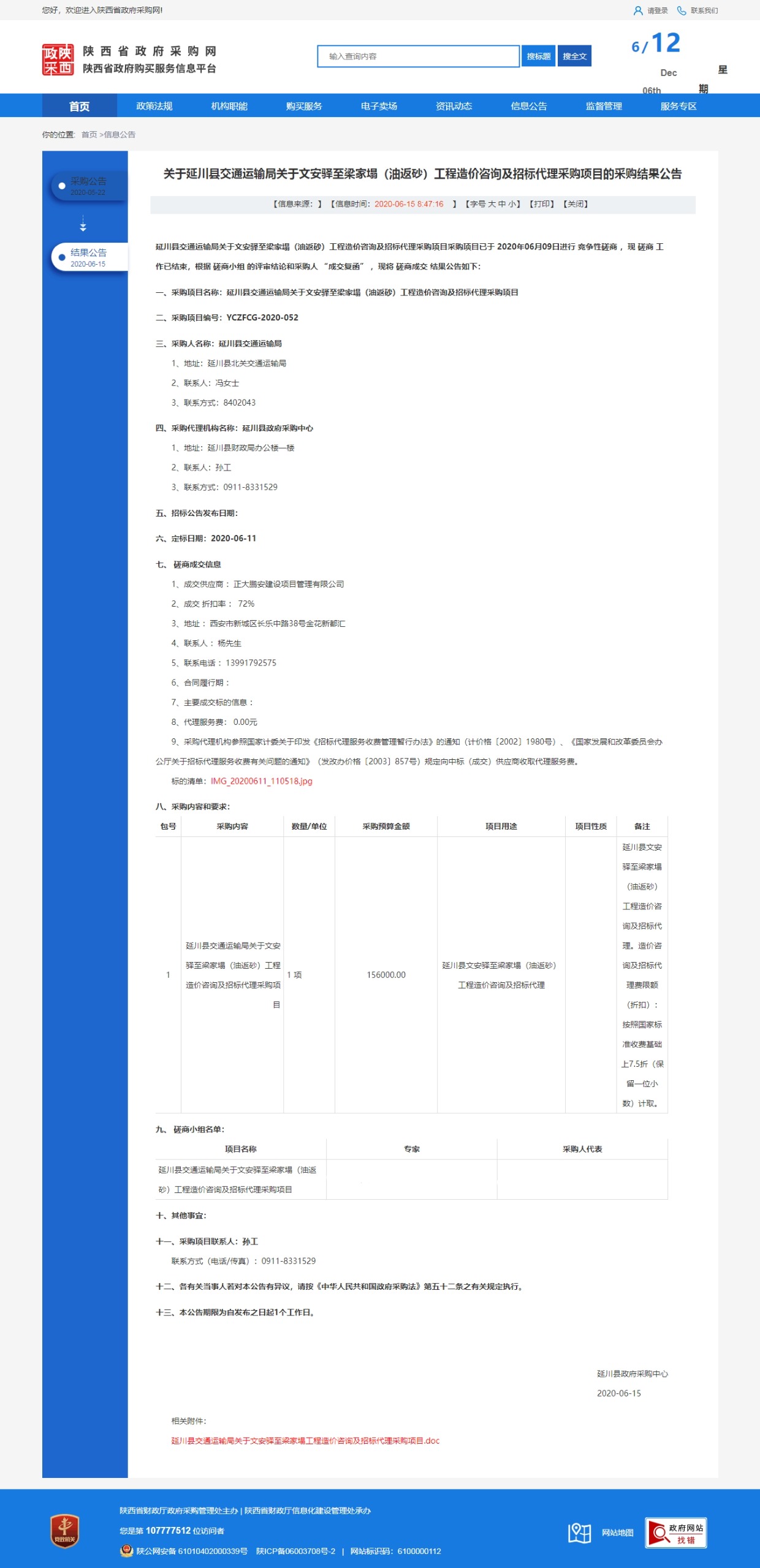 2020年6月9日,經(jīng)評標委員會綜合評審,招標人確認,正大鵬安建設項目管理有限公司中標延川縣交通運輸局關于文安驛至梁家塌(油返砂)工程造價咨詢及招標代理采購項目。