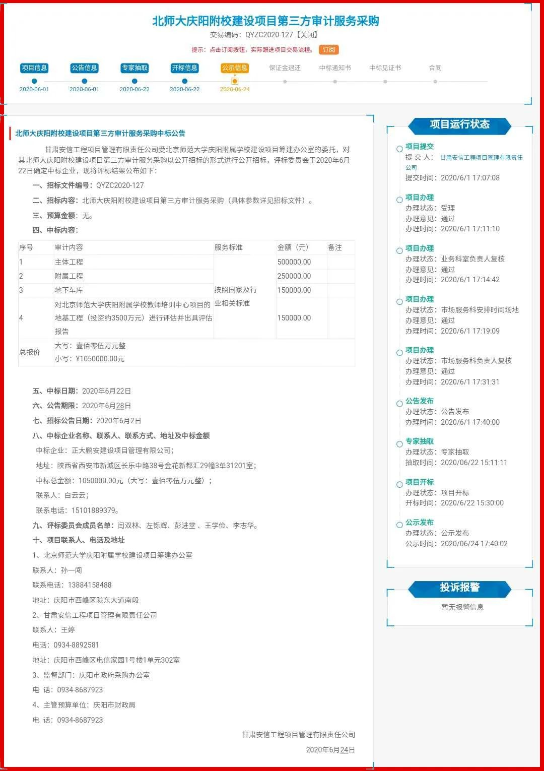 甘肅安信工程項目管理有限責任公司委托第三方,就“北師大慶陽附校建設(shè)項目第三方審計服務(wù)采購”進行公開招標,評標委員會于2020年6月22日確定中標企業(yè),正大鵬安公司中標該項目。