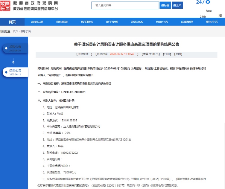 2020年6月12日,經(jīng)評標(biāo)委員會綜合評審,招標(biāo)人確認(rèn),正大鵬安中標(biāo)澄城縣審計局購買審計服務(wù)供應(yīng)商遴選項目。