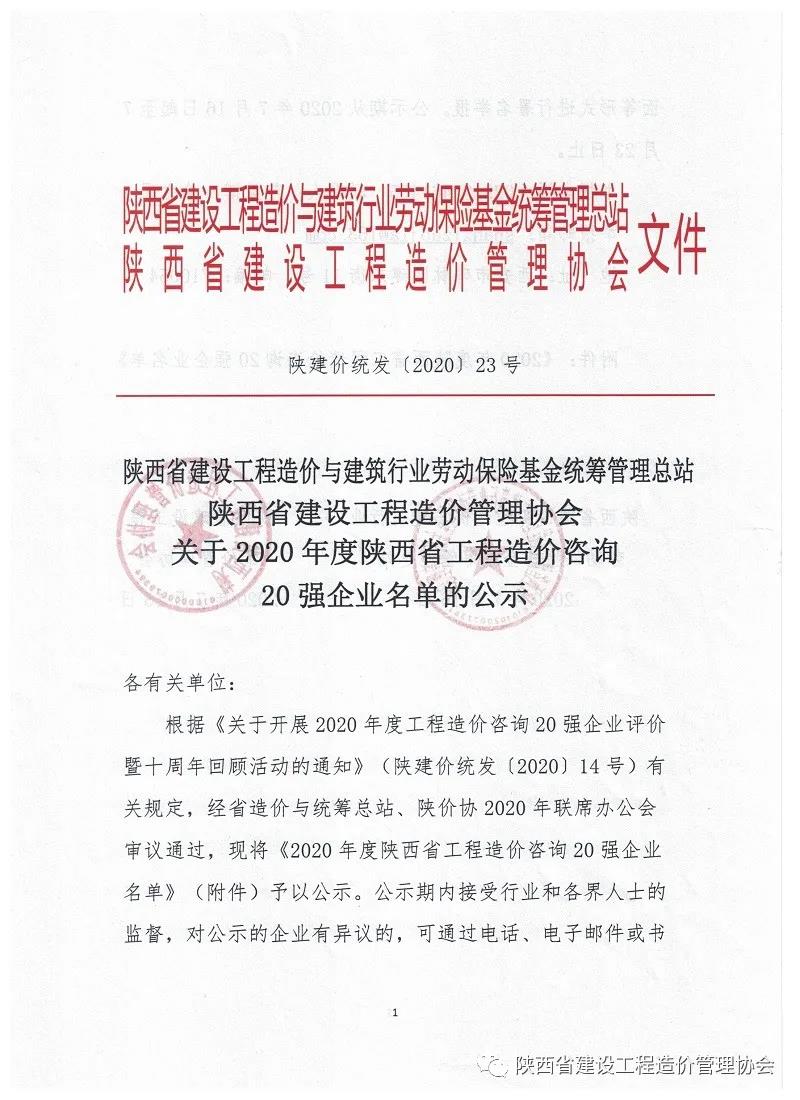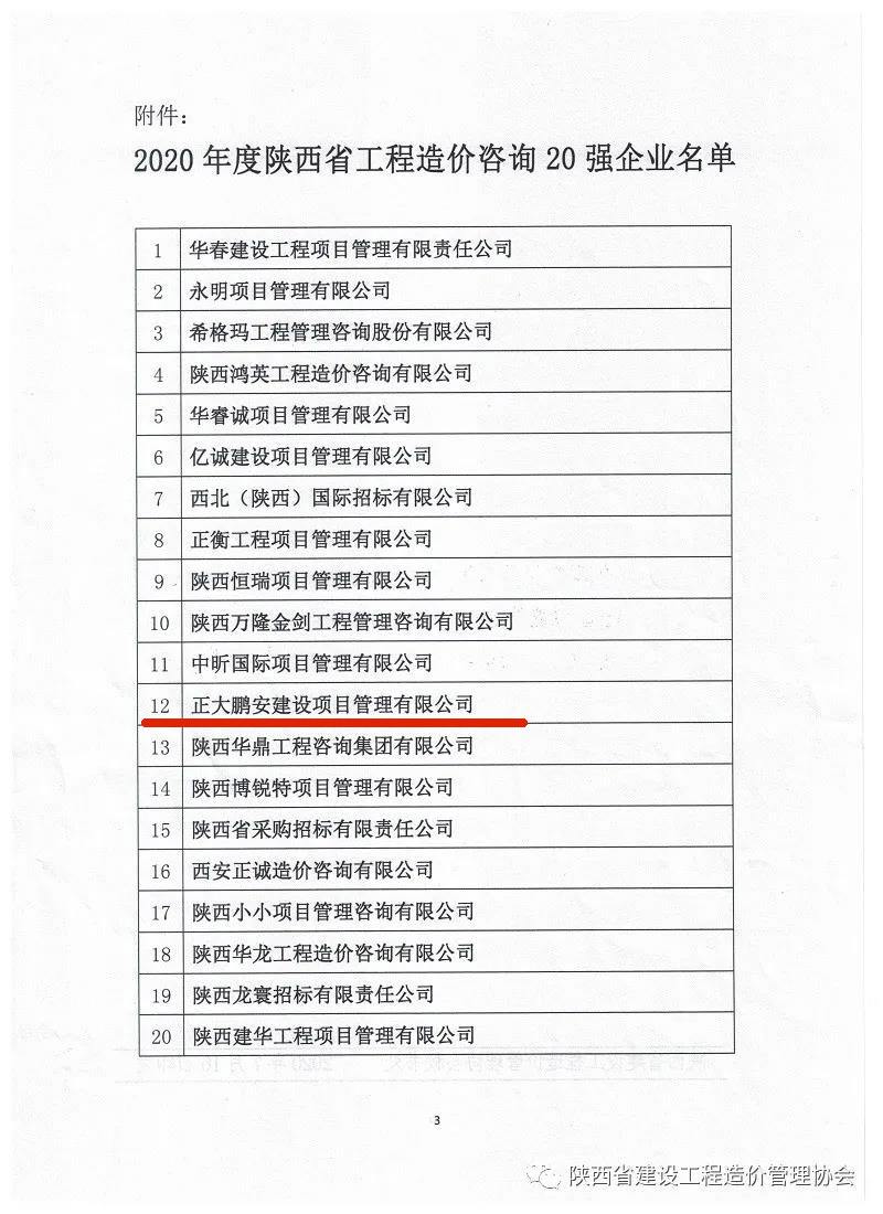 正大鵬安公司被評為“2020年度陜西省工程造價咨詢20強企業(yè)”
