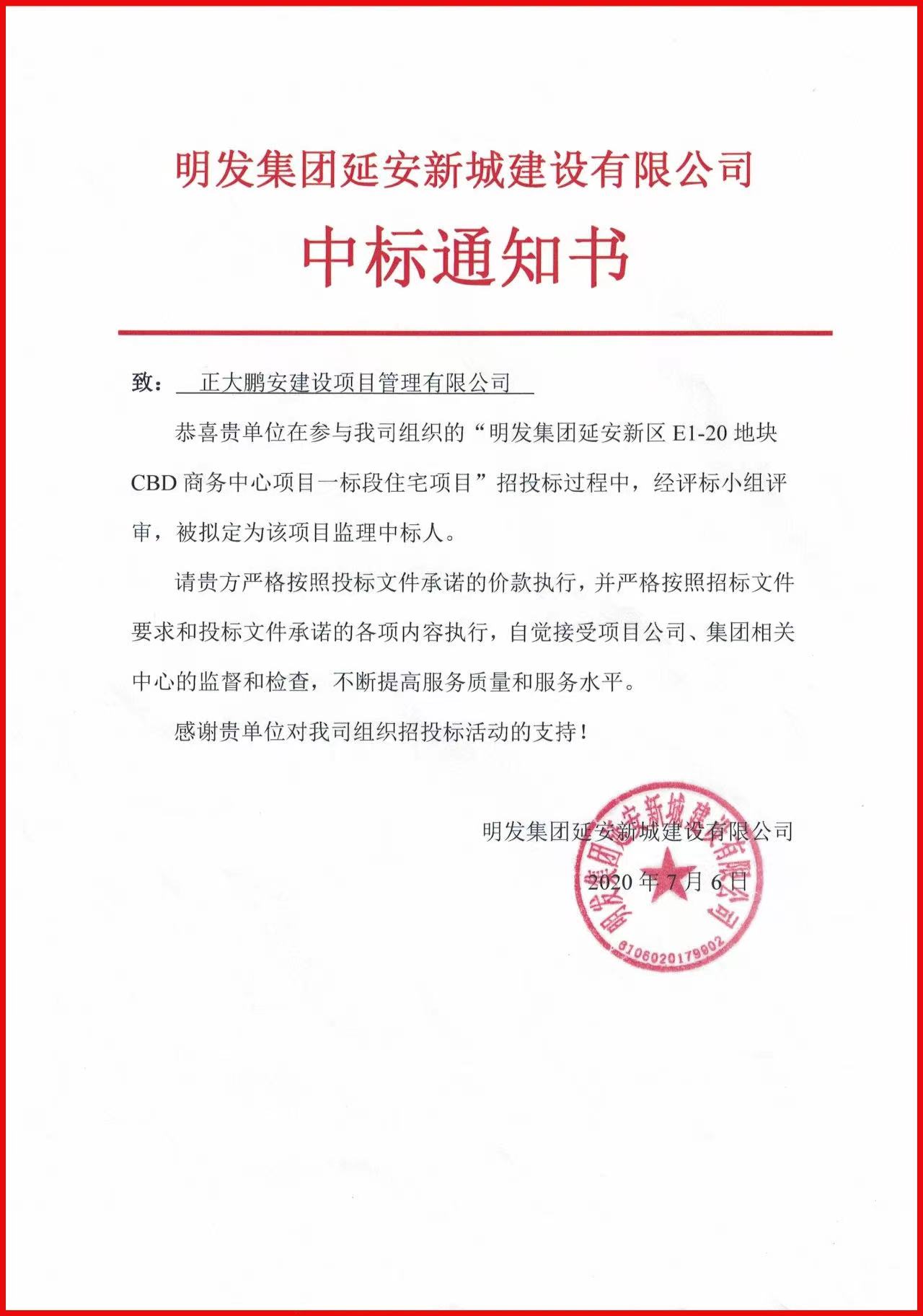 近期,我公司參與了明發(fā)集團延安新區(qū)E1-20地塊CBD商務中心項目一標段住宅項目的投標,經評標委員會綜合評審,招標人確認,正大鵬安建設項目管理有限公司被確認為中標單位。