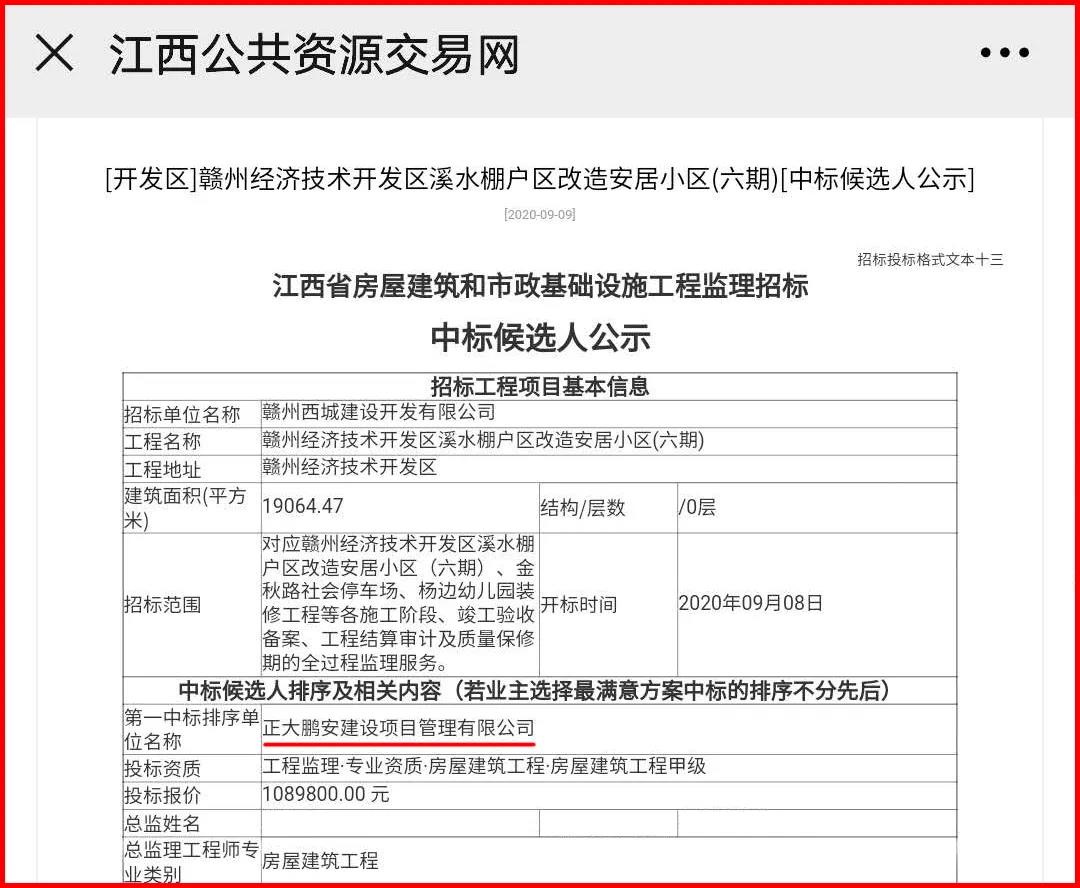 贛州經(jīng)濟技術(shù)開發(fā)區(qū)溪水棚戶區(qū)改造安居小區(qū)(六期)工程監(jiān)理項目進行公開招標(biāo),經(jīng)評標(biāo)委員會綜合評審,采購人確認,正大鵬安公司中標(biāo)該項目。