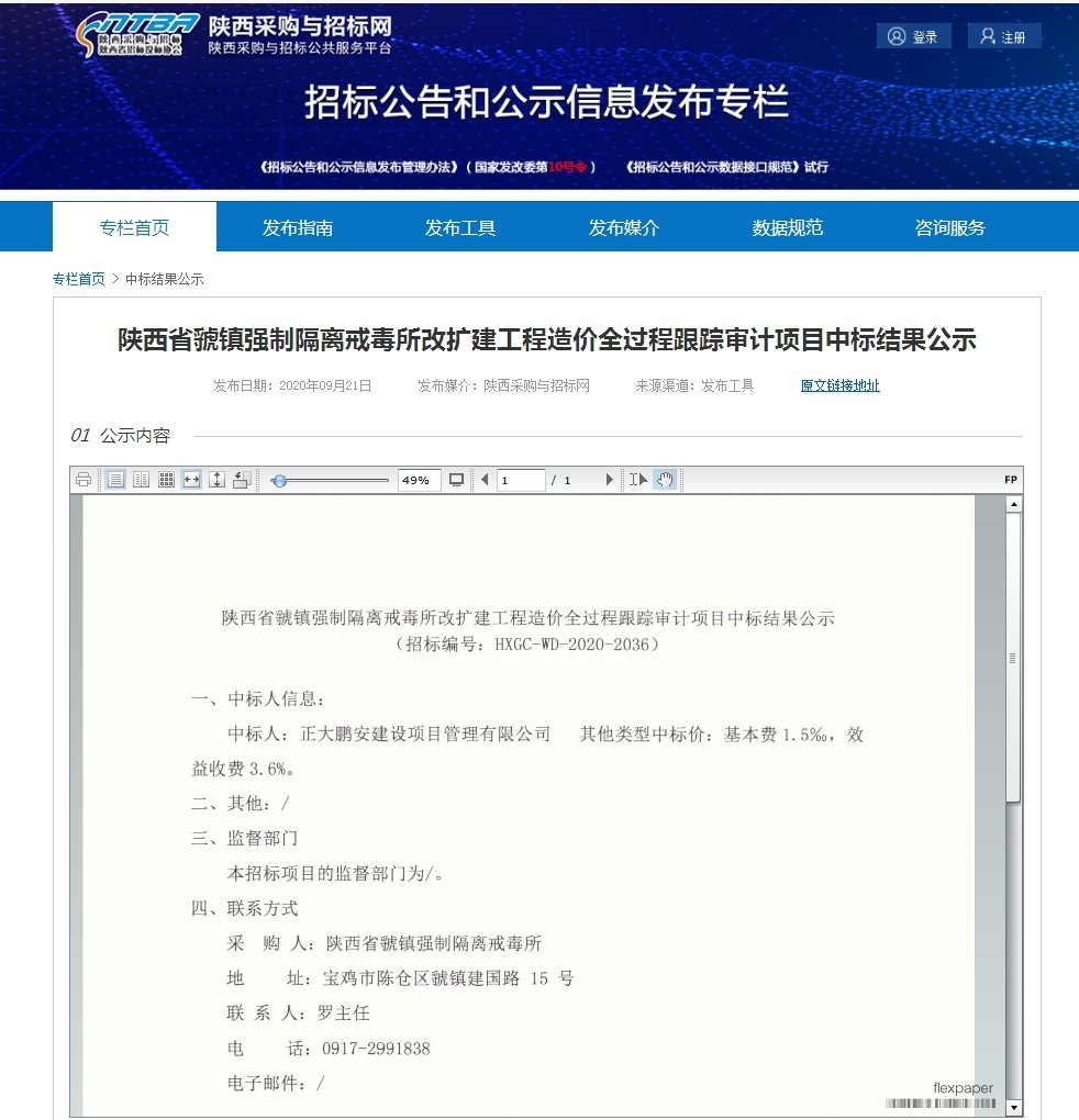 2020年9月,陜西省虢鎮(zhèn)強(qiáng)制隔離戒毒所委托第三方,就“陜西省虢鎮(zhèn)強(qiáng)制隔離戒毒所改擴(kuò)建工程造價(jià)全過程跟蹤審計(jì)項(xiàng)目”進(jìn)行公開招標(biāo),經(jīng)評(píng)標(biāo)委員會(huì)綜合評(píng)審,招標(biāo)人確認(rèn),正大鵬安公司中標(biāo)該全過程項(xiàng)目。