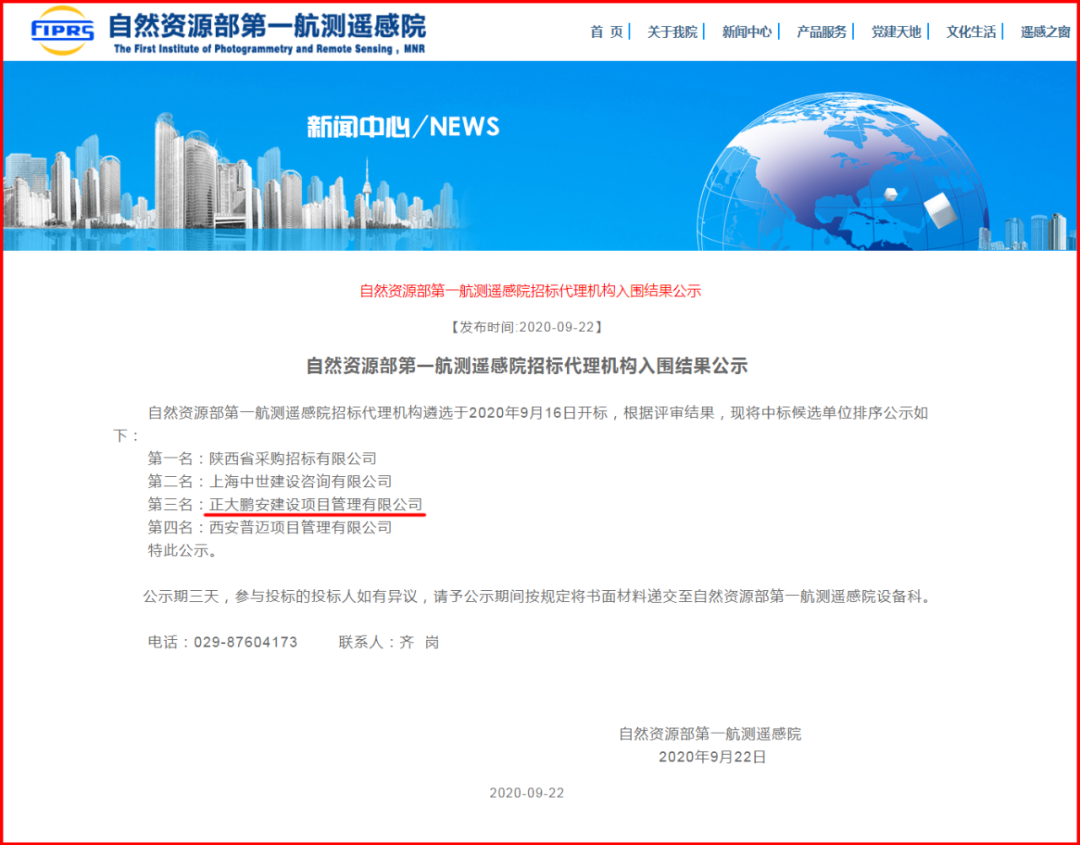 9月16日,自然資源部就第一航測遙感院招標(biāo)代理機(jī)構(gòu)入圍項(xiàng)目”進(jìn)行公開招標(biāo),經(jīng)評標(biāo)委員會綜合評審,采購人確認(rèn),正大鵬安公司入圍該項(xiàng)目。