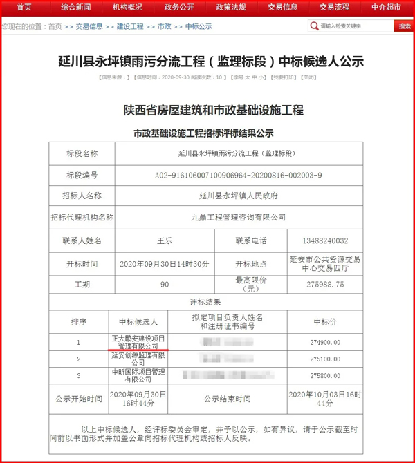 9月30日,延川縣永坪鎮(zhèn)人民政府就“延川縣永坪鎮(zhèn)雨污分流工程(監(jiān)理標(biāo)段)”進行公開招標(biāo),經(jīng)評標(biāo)委員會綜合評審,招標(biāo)人確認,正大鵬安建設(shè)項目管理有限公司中標(biāo)。