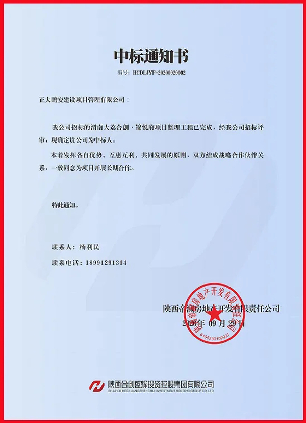 正大鵬安公司中標(biāo)陜西渭南大荔合創(chuàng)?錦悅府監(jiān)理項目