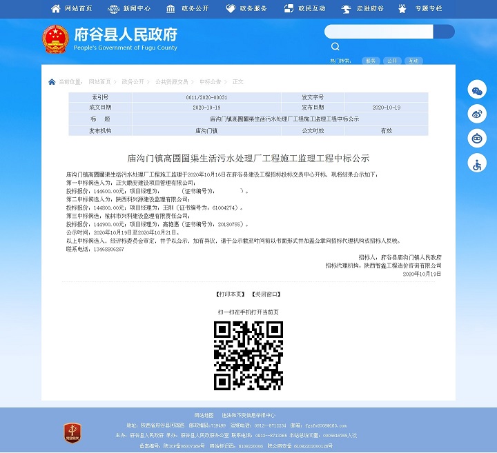 近日,廟溝門鎮(zhèn)高圐圙渠生活污水處理廠工程施工監(jiān)理于2020年10月16日在府谷縣建設工程招標投標交易中心開標,經(jīng)評標委員會綜合評審,招標人確認,正大鵬安建設項目管理有限公司中標。