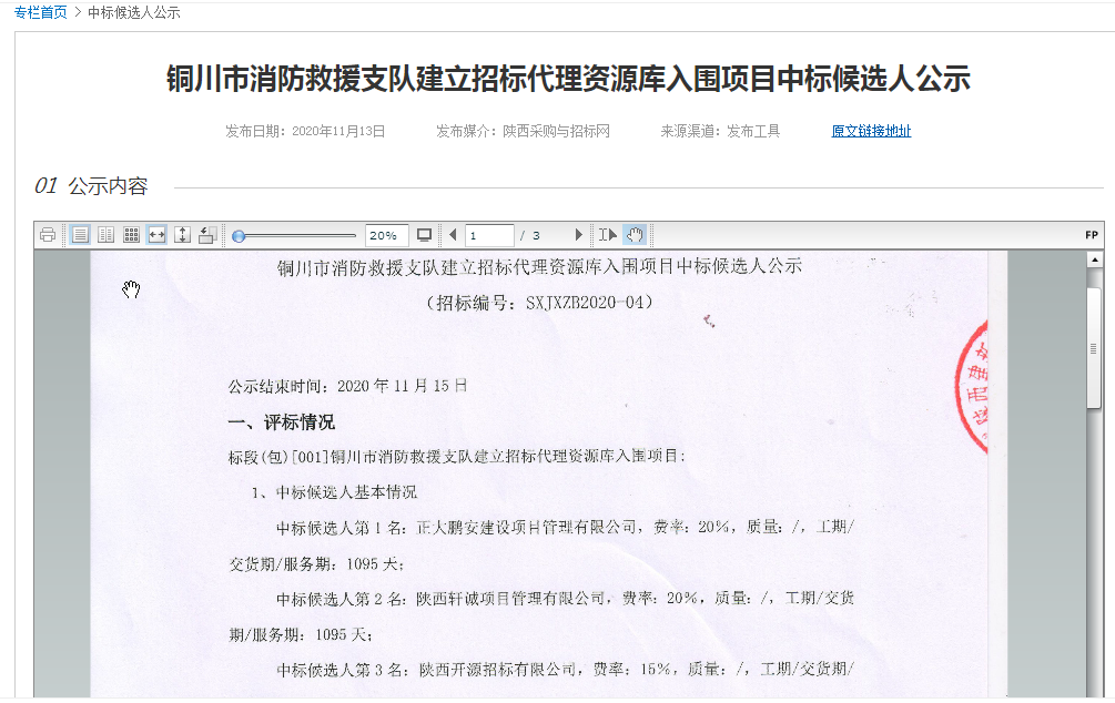 2020年11月10日,我公司參與“銅川市消防救援支隊建立招標代理資源庫入圍項目”招標項目,經(jīng)評審委員會綜合評審,招標人確認,正大鵬安公司入圍該項目。服務期限:三年