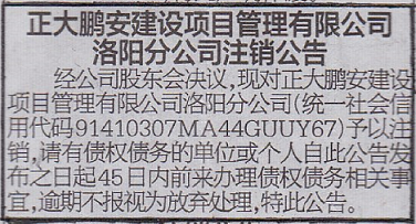經(jīng)公司股東會決議,對正大鵬安建設(shè)項目管理有限公司河南洛陽分公司(注冊號91410307MA44GUUY67)予以注銷,請有債權(quán)債務(wù)的單位和個人自登報之日起45日內(nèi)前來辦理相關(guān)事宜,逾期不報視為放棄處理,特此公告。