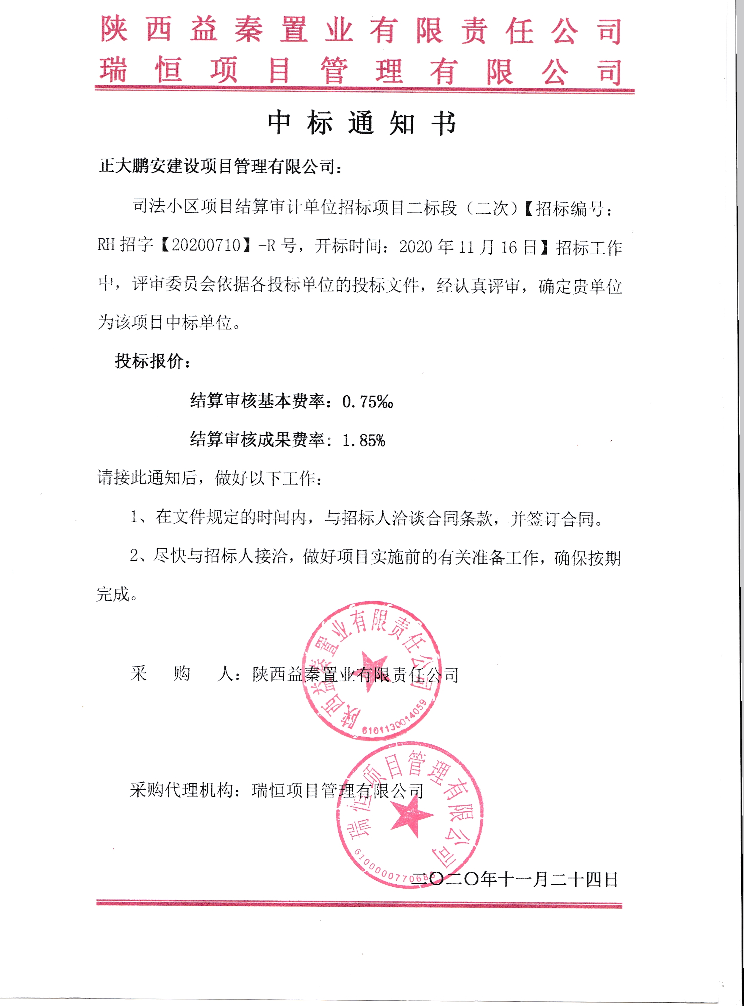 近日,我公司參與"司法小區(qū)項(xiàng)目結(jié)算審計(jì)單位招標(biāo)項(xiàng)目二標(biāo)段"項(xiàng)目,經(jīng)評審委員會綜合評審,招標(biāo)人確認(rèn),正大鵬安建設(shè)項(xiàng)目管理有限公司中標(biāo)。